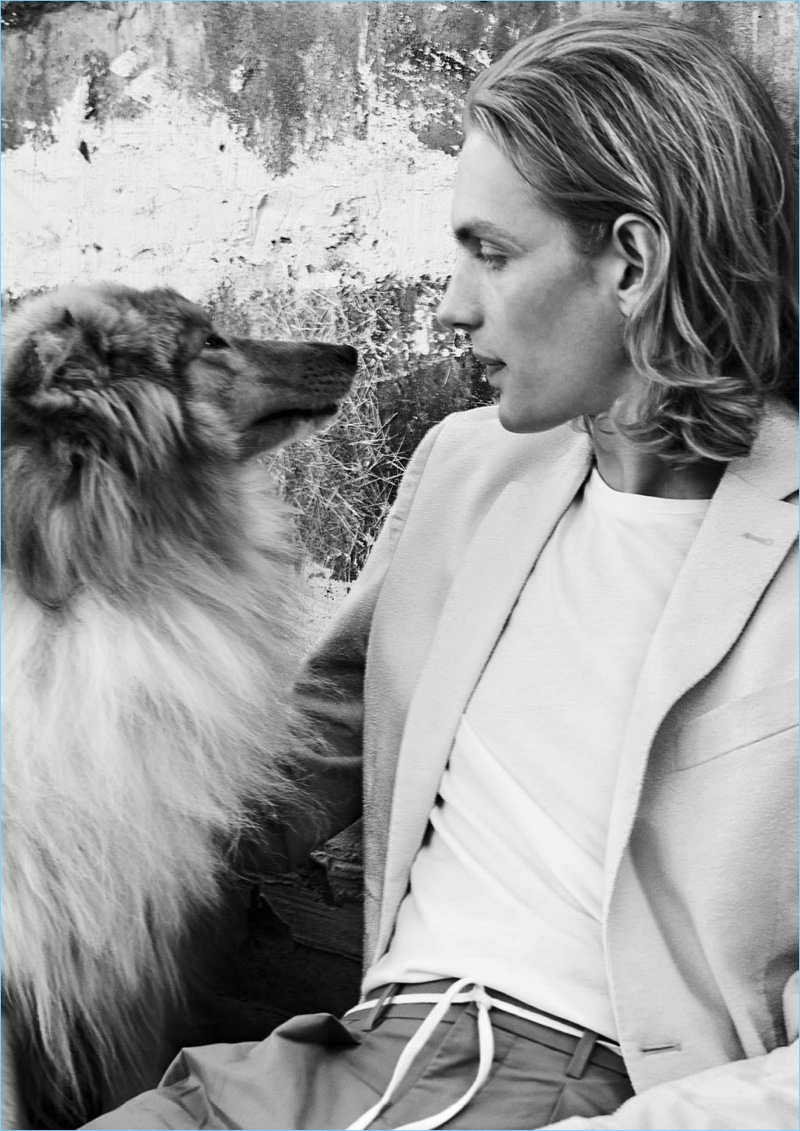 David Trulik veste t-shirt e tuta.Il modello di punta indossa una t-shirt$ 19,99 giacca slim fit in lana $ 239.99 e pantaloni $ il 99,99.